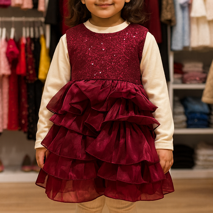 Girl Mahroon 2 Piece Fancy Sequence Frill Frock