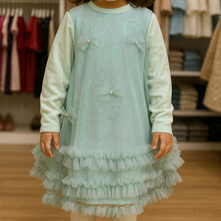 Girl Sea Green 2 Piece Fancy Sequence Bow Frill Frock